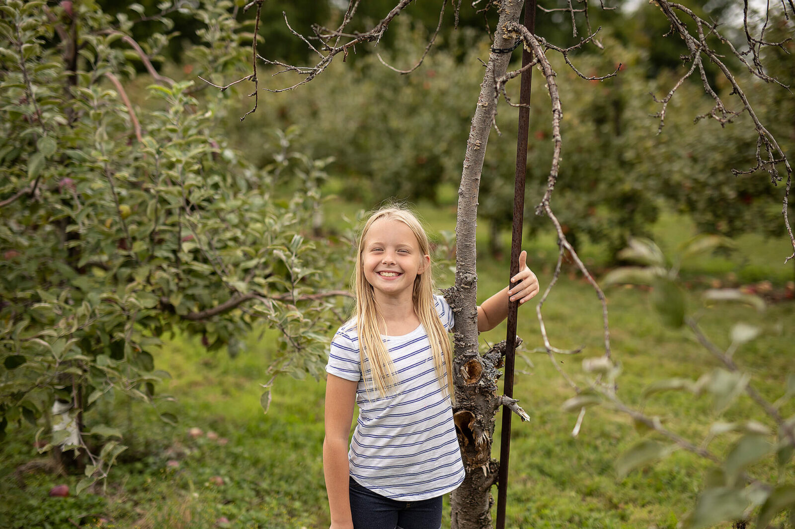 Young girl standing in front of an apple tree at apple hill orchard in mansfield ohio